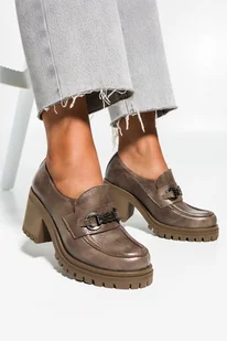 Beżowe mokasyny skórzane damskie ze srebrną ozdobą na szerokim klocku PRODUKT POLSKI Casu 20175