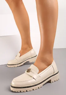 Beżowe Mokasyny z Cekinami wokół Podeszwy i Złotą Klamrą Elorasia