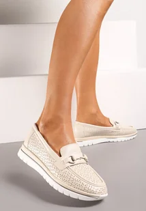Beżowe Mokasyny ze Skórzaną Wkładką Perforacją i Klamrą Gamiara