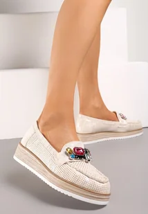 Beżowo-Srebrne Mokasyny ze Wstawką z Kolorowych Kamieni i Perforacją Veraila