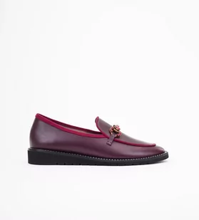 Mokasyny w kolorze bordowym ze złotą ozdobą wysadzaną czerwonymi kryształkami. Cholewka wykonana z naturalnej skóry licowej. W środku skórzana futrówka i wkładka zapewniająca stopom idealny komfort. Wokół cholewki otok z ozdbonymi srebrnymi nitami Miękka wkładka i podeszwa zwiększa uczucie wygody.
