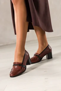 Brązowe mokasyny skórzane damskie na słupku z frędzlami i czarną sprzączką PRODUKT POLSKI Casu 6952-700-449