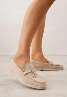Ciemnobeżowe Mokasyny z Imitacji Zamszu z Ozdobnym Przeszyciem i Zawieszką Veleyra