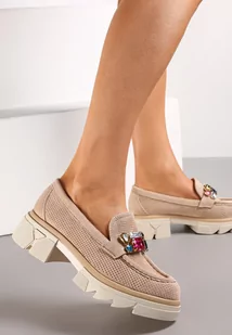 Ciemnobeżowe Mokasyny z Kryształami i Wkładką ze Skóry Naturalnej Zaidy
