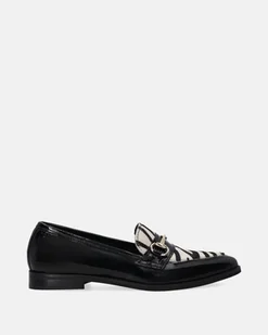 Mokasyny wykonane z czarnej, lakierowanej skóry o eleganckim połysku. Na przodzie cholewki znajduje się wstawka z naturalnego włosia z motywem zwierzęcym, która nadaje modelowi wyrazisty i oryginalny charakter. Całość uzupełnia złota ozdoba, subtelnie podkreślająca elegancki styl butów. Smukły, szpiczasty nosek i klasyczna płaska podeszwa zapewniają komfort i lekkość w codziennym noszeniu. Model łączy w sobie klasykę z modnym detalem.