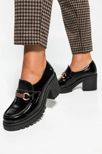 Czarne mokasyny skórzane damskie lakierowane ze złotą ozdobą na szerokim klocku PRODUKT POLSKI Casu 20175-41
