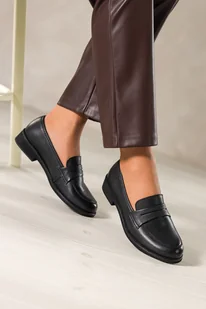 Czarne mokasyny skórzane damskie Sergio Leone na niskim szerokim obcasie ozdobny pasek na cholewce NP74887-H