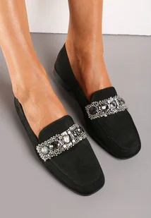 Czarne Mokasyny z Cyrkoniami i Perełkami na Klamerce Sybilla