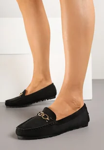 Czarne Mokasyny z Imitacji Zamszu Zdobione Metaliczną Aplikacją Soltewi