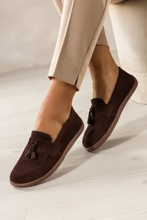 Czekoladowe mokasyny barefoot skórzane zamszowe damskie szerokie na elastycznej płaskiej podeszwie ozdobne chwosty PRODUKT POLSKI Casu 677