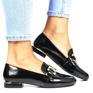 Damskie Półbuty Mokasyny Z Łańcuchem Płaskie Sergio Leone Mk732 Czarne/Złote Lakierowane