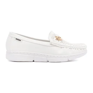 Przedstawiamy białe damskie mokasyny Goodin, które łączą elegancję z niezrównanym komfortem. Te wsuwane buty wyróżniają się prostym, a zarazem stylowym designem, idealnie nadającym się na wiele okazji zarówno do codziennych, jak i bardziej formalnych stylizacji. . Mokasyny wykonane są z wysokiej jakości skóry ekologicznej, która nie tylko dobrze się prezentuje, ale także zapewnia wygodę noszenia. O komfort dba także wkładka z naturalnej skóry, która dopasowuje się do kształtu stopy, gwarantując uczucie miękkości i amortyzacji przy każdym kroku. . Ażurowa struktura cholewki zapewnia odpowiednią