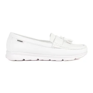 Przedstawiamy eleganckie białe mokasyny z frędzlami na niskiej koturnie od renomowanego producenta Goodin. Te damskie buty łączą w sobie wygodę i modny design, idealne do codziennego użytku oraz na specjalne okazje. . Mokasyny wykonane są z wysokiej jakości materiałów: zewnętrzna część z ekologicznej skóry zapewnia trwałość i stylowy wygląd, natomiast wnętrze, składające się z 50% skóry naturalnej oraz imitacji, gwarantuje komfort noszenia. Okrągły nosek dodaje im lekkości, a zabudowany zapiętek zabezpiecza stopę.