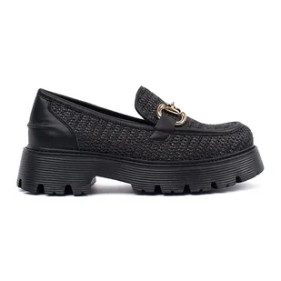 Mokasyny Goodin to elegancki wybór dla nowoczesnych kobiet, które cenią sobie komfort i styl. Wykonane z ekologicznej skóry w klasycznym czarnym kolorze, stanowią doskonałą bazę do wielu stylizacji. Dzięki wsuwanemu zapięciu i zabudowanemu zapiętkowi, ich zakładanie jest niezwykle proste i wygodne. . Platforma o wysokości 4,5 cm nie tylko dodaje elegancji, ale również zapewnia stabilność podczas chodzenia, co czyni je idealnym wyborem na co dzień. Dodatkowym atutem jest efektowny złoty łańcuch, który nadaje im wyjątkowego charakteru i sprawia, że wyróżniają się w tłumie.