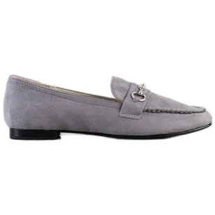 Kobiece mokasyny o klasycznym fasonie. Zewnętrzna strona cholewki wykonana jest z ekologicznej zamszowej skóry w kolorze szarym. Z przodu buty mają zaokrąglone noski, nad którymi znajduje się dekoracja w formie złotej sprzączki. Z tyłu obuwie ma zabudowany miękki zapiętek, ułatwiający wsuwanie na stopę. Goodin Eleganckie Moksyny szare.