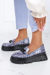 Grafitowe mokasyny lakierowane na platformie krokodyli wzór czarny łańcuch POLSKA SKÓRA Casu 08835-40
