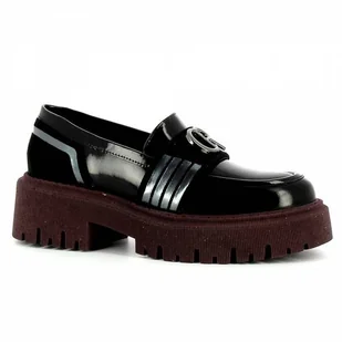 CZARNE SKÓRZANE LAKIEROWANE MOKASYNY DAMSKIE NA FIOLETOWEJ PLATFORMIE
