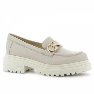 Fason tych mokasyn oparty jest na grubej platformie, dzięki której nie tylko poczujesz się wygodnie, ale dodasz sobie również kilku cennych centymetrów wzrostu. Buty te wykonane są z wysokogatunkowej skóry naturalnej. Model posiada subtelne zdobienie w postaci metalowego logotypu marki Carinii, dzięki czemu wyróżnisz się z tłumu! Kolorystyka złamanej bieli doskonale dopełni każdą Twoją stylizację. Te półbuty