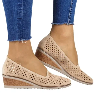 PÓŁBUTY AŻUROWE MOKASYNY NA KOTURNIE POTOCKI 12306 BEŻOWE ZAMSZOWE