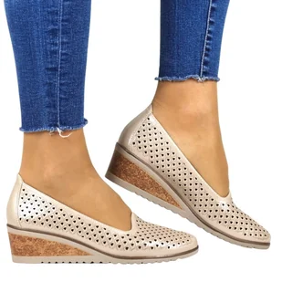 Półbuty na koturnie ażurowe w beżowym kolorze to stylowe i wygodne obuwie. Wykonane z wysokiej jakości materiałów, posiadają wkładkę skórzaną. Koturna to obc...
