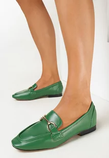 Zielone Wsuwane Mokasyny na Płaskim Obcasie z Ozdobną Klamrą i Kwadratowym Noskiem Wendreda