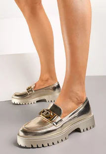 Złote Mokasyny z Imitacji Zamszu z Geometryczną Klamerką Echonesa