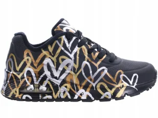 Kobiety, Rodzaj produktu: Trampki, Kolor: Czarny, Materiał: Skóra syntetyczna Zapięcie: Sznurowane Damskie buty treningowe Skechers UNO Metallic Love Sznurowane buty damskie Skechers Sporty gumowa podeszwa czarny Skechers Uno-Metallic Love 155523-BKGDSkechers Uno-Metallic Love 155523-BKGD