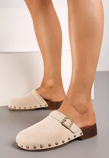 Beżowe Klapki Chodaki na Płaskiej Podeszwie Ozdobione Nitami i Klamrą Aletta