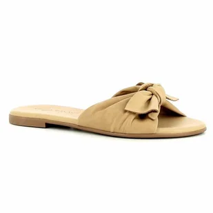 BEŻOWE SKÓRZANE KLAPKI DAMSKIE Z KOKARDĄ NA PŁASKIEJ PODESZWIE