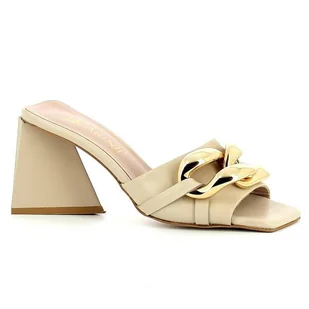 BEŻOWE SKÓRZANE KLAPKI DAMSKIE NA OBCASIE Z OZDOBĄ