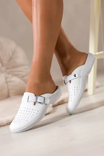 Białe klapki damskie Inblu sanitarne medyczne skórzana wkładka pasek ze srebrną klamrą ZV999998