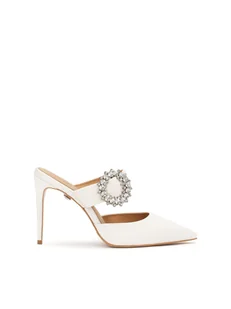 <p><span><strong>Klapki</strong> </span>z pełnym, spiczastym noskiem oraz smukłym obcasem zachwycają oryginalnym designem. Uwagę przykuwa okrągła klamra przy pasku ozdobiona dużymi, połyskującymi cyrkoniami. Model ze <strong>ślubnej kolekcji</strong> wykonany jest z białej <strong>tkaniny</strong> o satynowym wykończeniu. Klapki z biżuteryjnym zdobieniem będą ciekawą alternatywą dla klasycznych sandałów i czółenek. Dzięki nim suknia ślubna zy