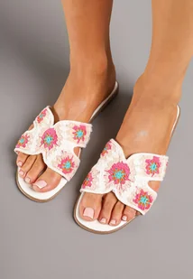 Biało-Różowe Szydełkowe Klapki w Kwiaty na Płaskiej Podeszwie Carela