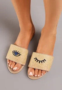 Ciemnobeżowe Klapki z Plecionymi Paskami z Haftowanym Motywem Oczu Minaco