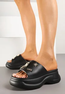 Czarne Klapki na Platformie z Metalowymi Aplikacjami i Cyrkoniami Dorlia
