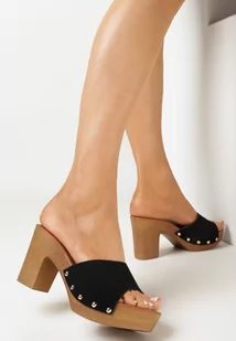 Czarne Klapki na Słupku z Szerokim Paskiem z Nitami i Otwartym Noskiem Hirgellan