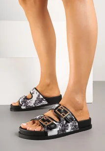 Czarno-Białe Klasyczne Klapki z Paskami ze Sprzączkami Redenelle