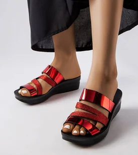 Czerwone błyszczące klapki Loli to idealny wybór na gorące letnie dni. Wykonane z eko-skóry i wyposażone w gumową podeszwę, zapewniają nie tylko elegancki wygląd, ale także wygodę i trwałość noszenia. Klapki posiadają na koturnie średni obcas, który dodaje wysokości, a okrągły nosek sprawia, że są one bardzo wygodne dla stóp. To rewolucyjne połączenie klasyki i nowoczesnego stylu. Te popularne damskie klapki są idealnym wyborem zarówno do codziennych stylizacji, jak i bardziej formalnych okazji.