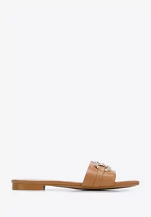 Damskie klapki skórzane z połyskującą klamrą brązowe 38