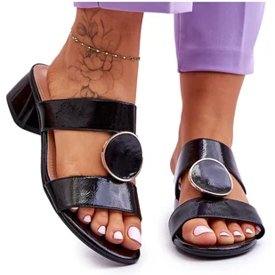 Eleganckie klapki damskie zostały wykonane z eko skóry. Model ten osadzono na obcasie w postaci klocka. Posiadają ozdobę pomiędzy paseczkami w kształcie koła. Miękka wkładka zapewni wygodę nawet przez cały dzień i została wykonana z naturalnej skóry. Modny, klasyczny fason z odkrytym, zaokrąglonym noskiem.