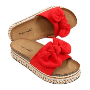 Zamszowe klapki damskie. To absolutnie najmodniejszy fason na zdobionej podeszwie i z przepiękną kokardą. . . Profilowana wkładka sprawi, że nie straszne będą długie, letnie spacery : ) Gwarantujemy, że te klapki z pewnością staną się Twoją ulubioną parą butów na lato! Materiał zewnętrzny zamsz ekologiczny. Klapki na zdobionej podeszwie czerwone 7705 Red.