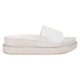 Melisa Klapki Na Koturnie w kolorze białym to bardzo urocze i kobiece damskie obuwie. Buty wykonane są ze skóry ekologicznej, natomiast podeszwa z gumy z bieżnikiem. Dodatkowo buciki ozdobiono srebrnymi dżetami oraz ćwiekami przy podeszwie. Wysokość koturny wynosi 4 cm, dzięki czemu klapki są bardzo wygodne. Melisa Klapki Na Koturnie białe.