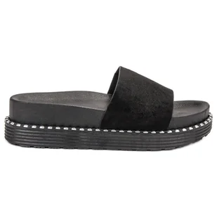 Melisa czarne Klapki Na Koturnie to bardzo modne w tym sezonie obuwie letnie. Klapki świetnie pasują do codziennych stylizacji. Możesz nosić je do jeansów oraz sukienek i spódnic. Buty wykonane zostały ze skóry ekologicznej, natomiast podeszwa z gumy z bieżnikiem. Dodatkowo ozdobiono je ćwiekami oraz dżetami.