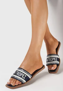 Niebieskie Klapki z Kwadratowym Noskiem z Cyrkoniami i Ozdobnym Napisem Gromia