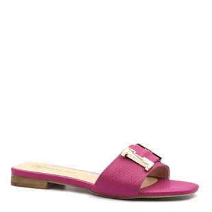 Eleganckie różowe klapki wykonano z naturalnej skóry licowej z widocznym uziarnieniem. Szeroki pasek butów ozdobiono złotą ozdobą ze skórzaną wstawką. Wkładkę w klapkach wykonano ze skóry naturalnej. Wymiary podawane na kartach produktów to wymiary orientacyjne i odnoszą się do rozmiaru 37.