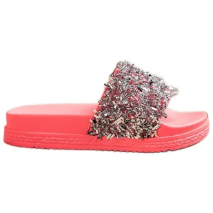Wygodne damskie obuwie letnie z elegancką i atrakcyjną dekoracją. Klapki mają standardowo odkryte zarówno noski, jak i całą tylną część. Nad palcami umieszczono szeroki pasek z tworzywa, na którym naklejone są drobne srebrne kryształki. Buty są na 3,5-centymetrowej platformie w kolorze malinowym, o karbowanych brzegach. Seastar Klapki Z Kryształkami Fashion czerwone różowe.