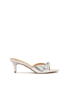 <p><strong>Klapki</strong> na obcasie wykonane z<strong> tłoczonej skóry </strong>w srebrnym kolorze to eleganckie i stylowe obuwie, które przyciąga uwagę swoim wyjątkowym designem i wysoką jakością wykonania. Te luksusowe klapki prezentują się niezwykle zmysłowo i kusząco, łącząc w sobie klasykę z odrobiną ekstrawagancji. Ich główną cechą charakterystyczną jest połyskująca skóra, efektownie wycięta cholewka oraz urocza kokarda. Obcas umiarkowanej wysokości, sprawia