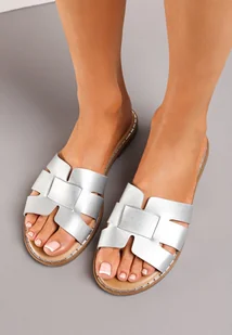 Srebrne Klapki z Metalicznym Szerokim paskiem z Wycięciami Ademina