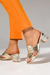 Złote klapki damskie na ozdobnym klocku z kryształkami skórzana wkładka Casu ER24X7-G