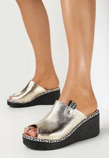 Złote Klapki na Koturnie z Szerokim Paskiem Eshala